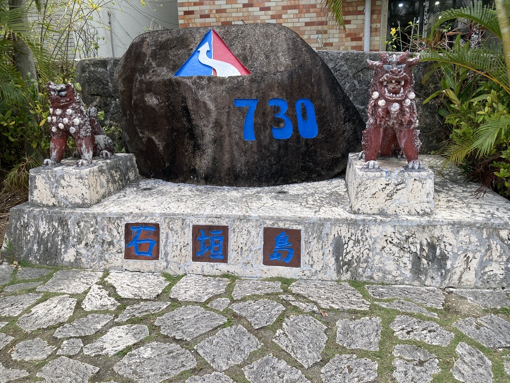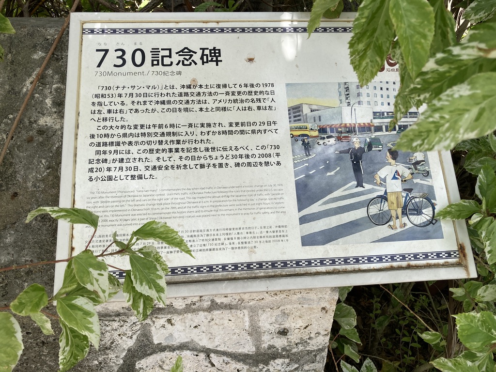 途中にあった「730記念碑」。沖縄の本土復帰の6年後、1978年の道路交通の変更で、米国統治下の「車は右側通行」から、「車は左側通行」に変わったことなどの記念碑。