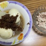 照り焼きチキンのデニッシュ、ツナとブロッコリー、野菜のサンドイッチ、オルゾとベーコン風味のスープ、ココナッツムース。