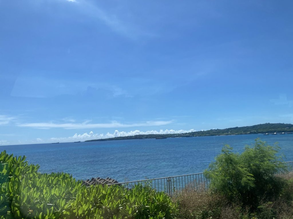 ほんとは車の運転ができれば、レンタカーを借りてあちこち自在に行けるんでしょうけれど、長年ペーパードライバーで、運転できる気がちっともしない。バスのいいところだと思ったのは、景色を思う存分楽しめたこと。バスが海沿いの道路を走ると青い海と空と白い雲。あ〜、沖縄に来たぞーと思いながらあっという間の2時間。