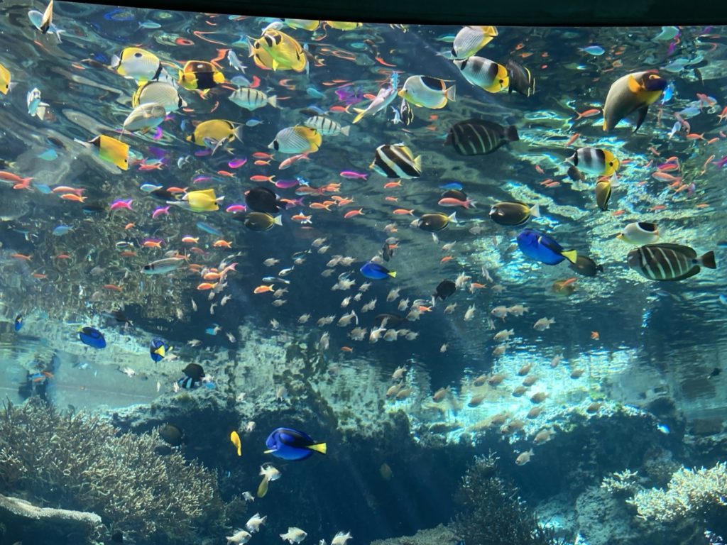 もう、この色とりどりのお魚たちに出会えただけで来た甲斐がありました。ため息が出る。ずっと昔にハワイのハナウマ湾でシュノーケリングしたときの感動を思い出しました。