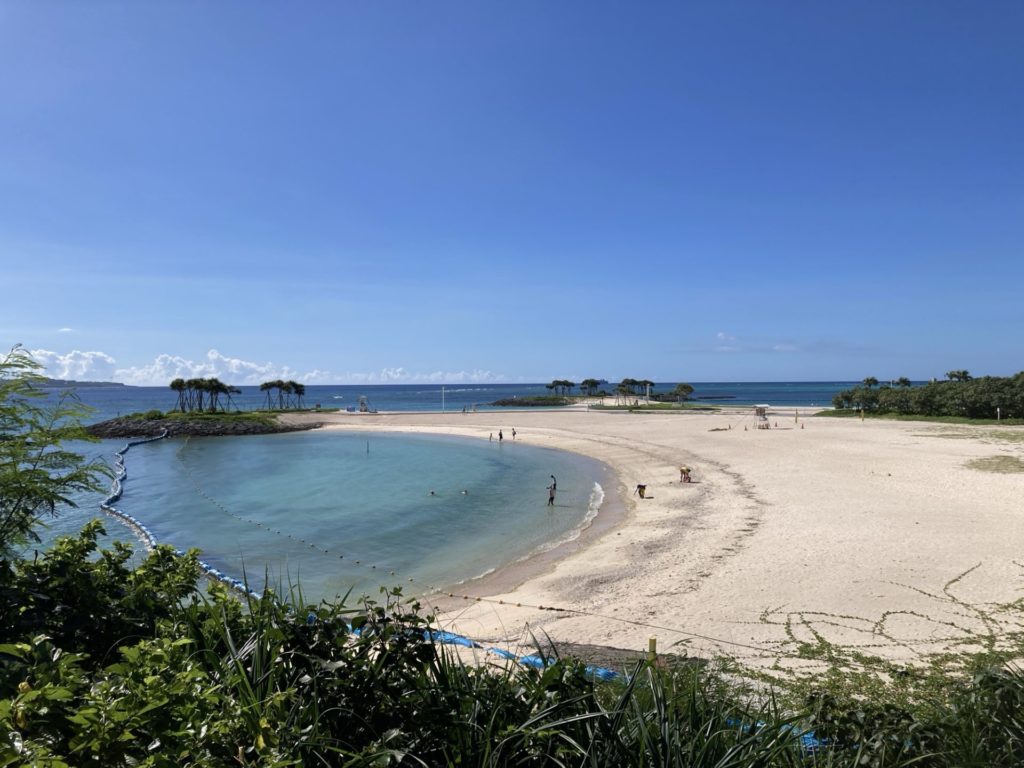 沖縄の海は砂が細かくてきれい。泳がないけど水際まで近づいて波の音を聞く。