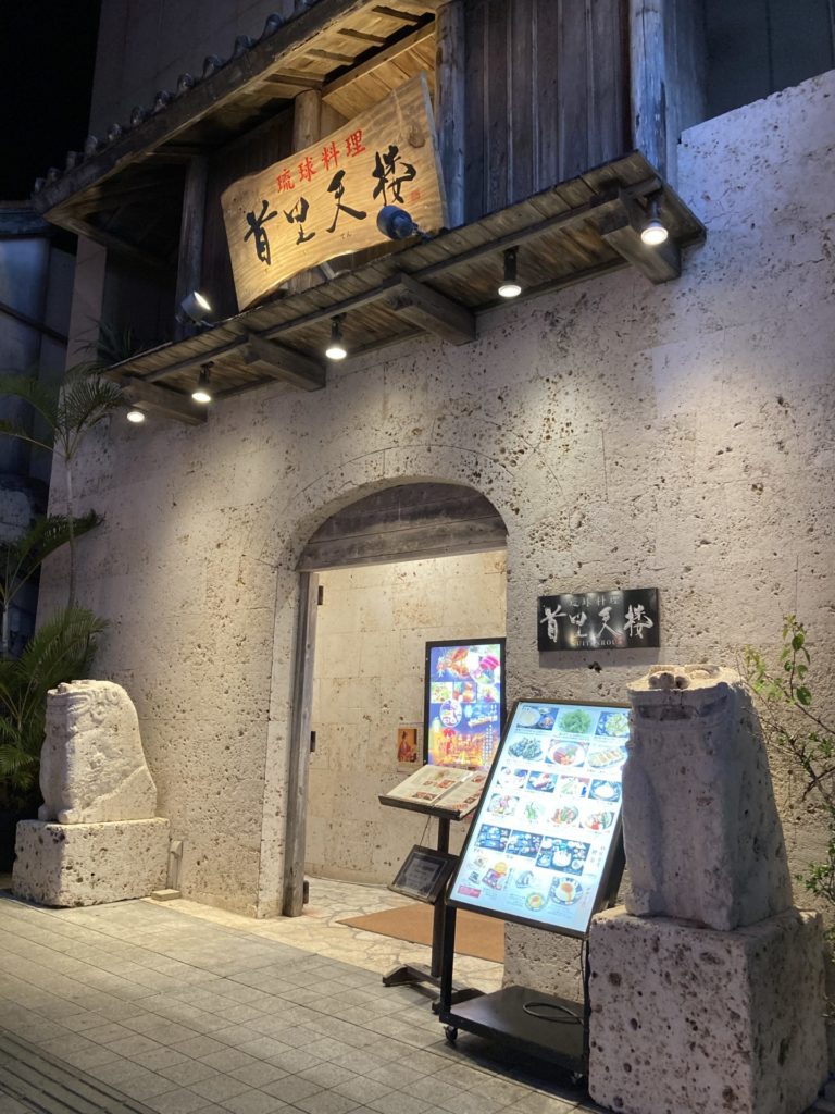 美ら海でもろくにランチも食べずに帰ってきたので、お腹がぺこぺこ。ステーキのお店などはたくさんあるのだけれど、1人で入れて落ち着いて食べれそうな、美味しそうなところはないか、と歩いていると、心惹かれる琉球料理のお店を見つけた。「琉球料理 首里天楼」さん。もう21時過ぎだけど、食事。