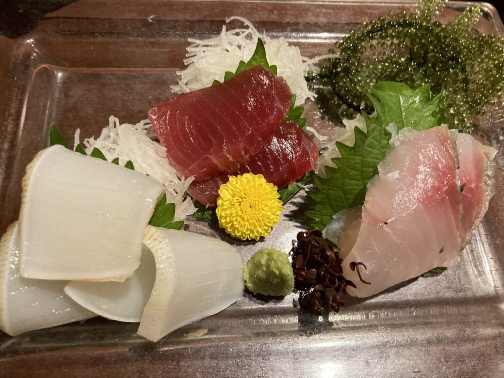 刺身は新鮮! 歯応えがとてもよい。イカってこんなに美味しかったっけ。緑のつぶつぶは初めて。海ぶどう。口の中でプチプチ。気持ちのいい食感だ。